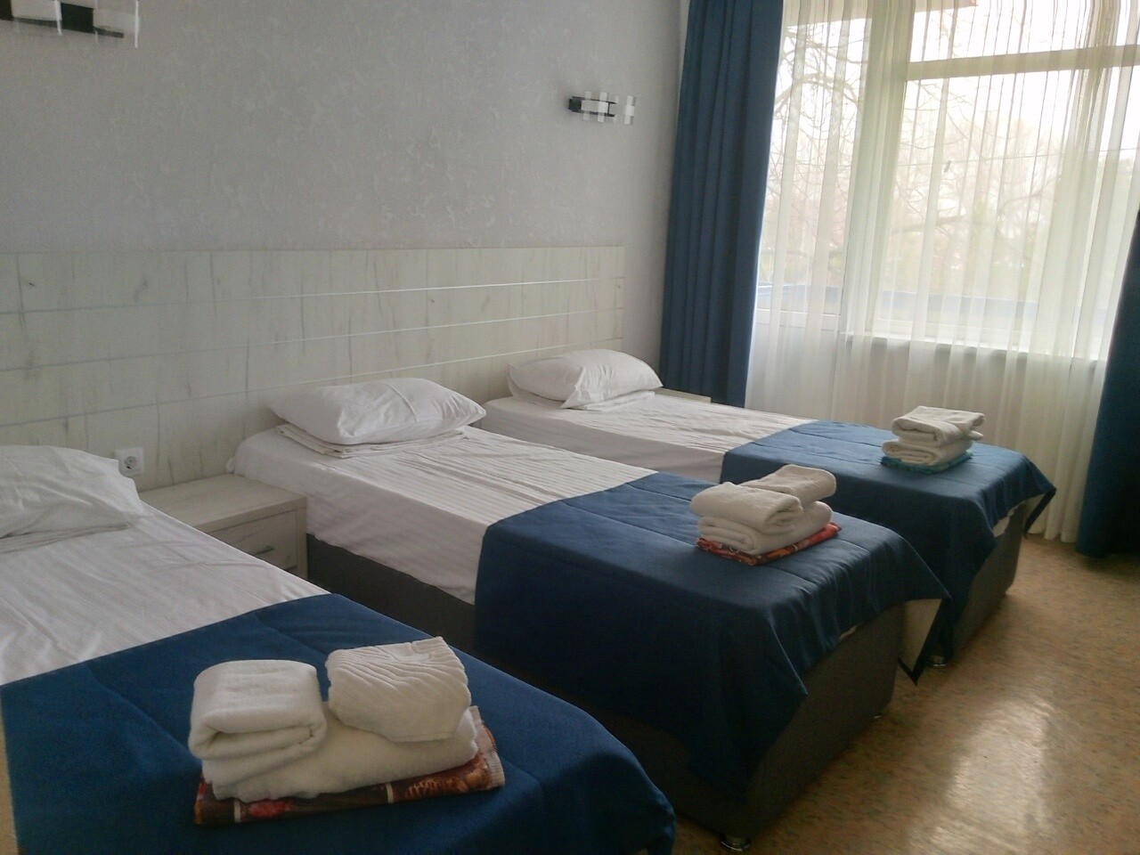 Однокомнатный номер с тремя односпальными кроватями. Из окон открывается вид на озеро и бассейн. Есть выход на балкон.